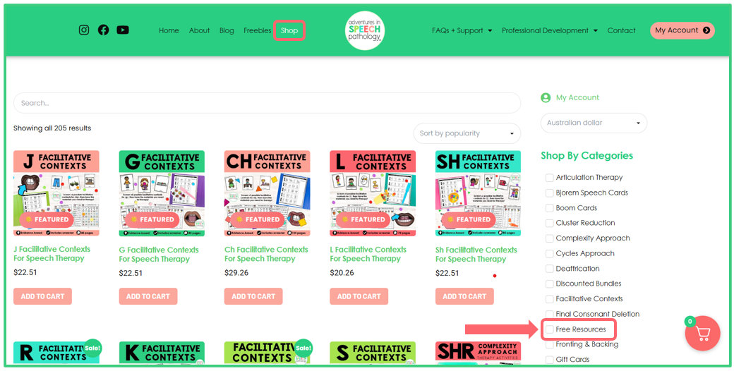- SHOP: Go to our website home page and click on the "Shop" tab or click HERE. There you will be able to select the "Free Resources" category highlighted below.